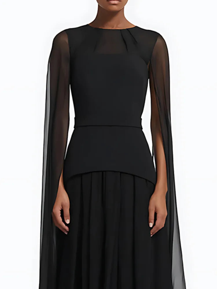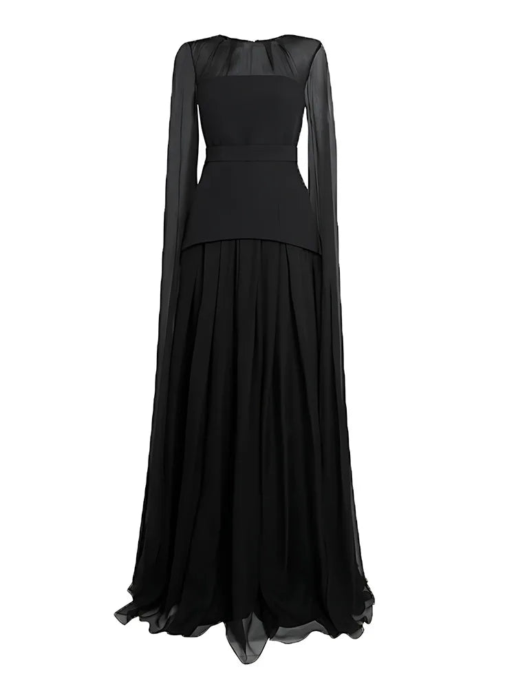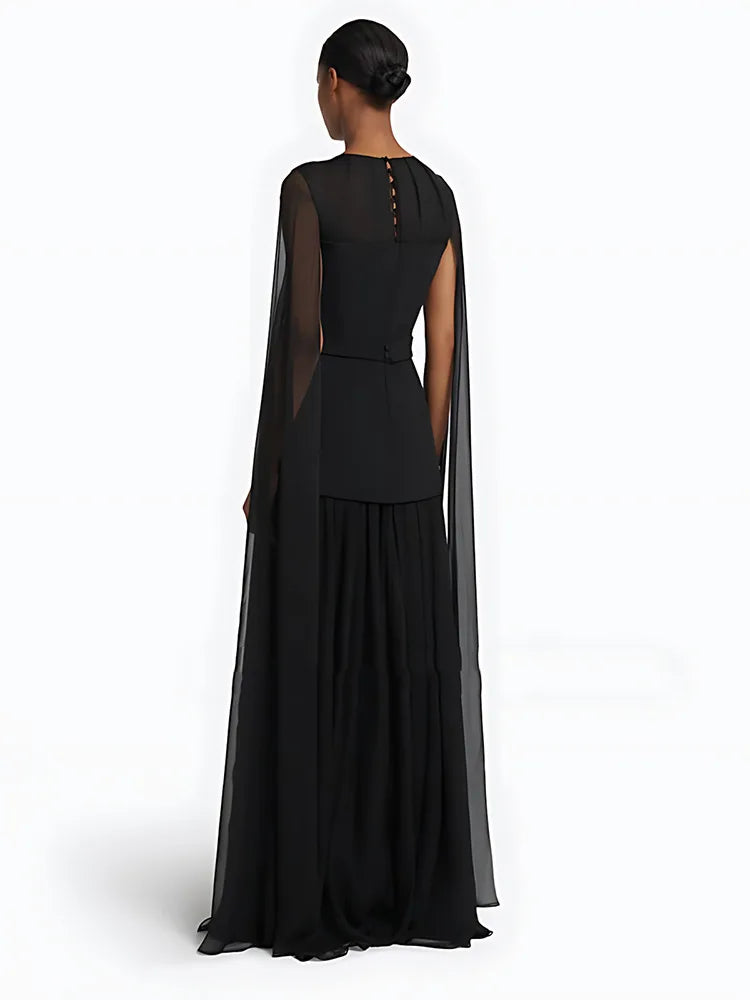 Elegant Black Chiffon With Sheer Cape Sleeves Maxi Dress