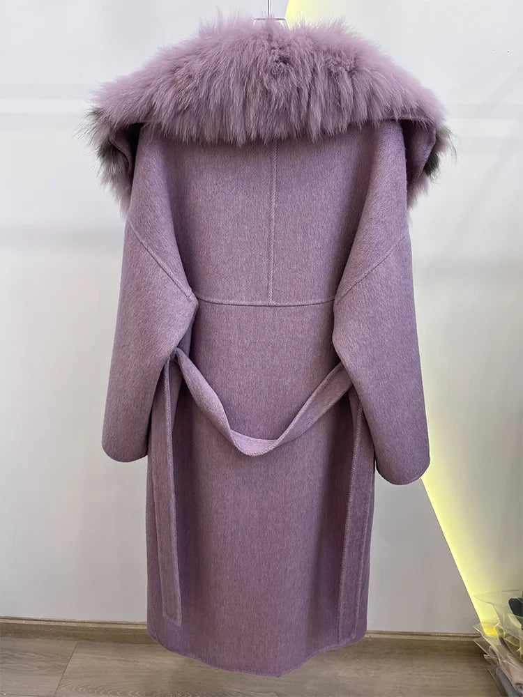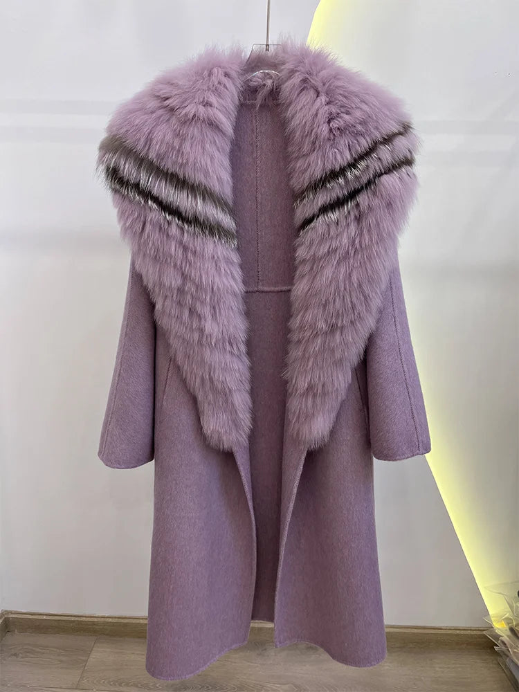 Long Wool Cashmere Blended With Big Real Silver Fox Fur Collar Coat