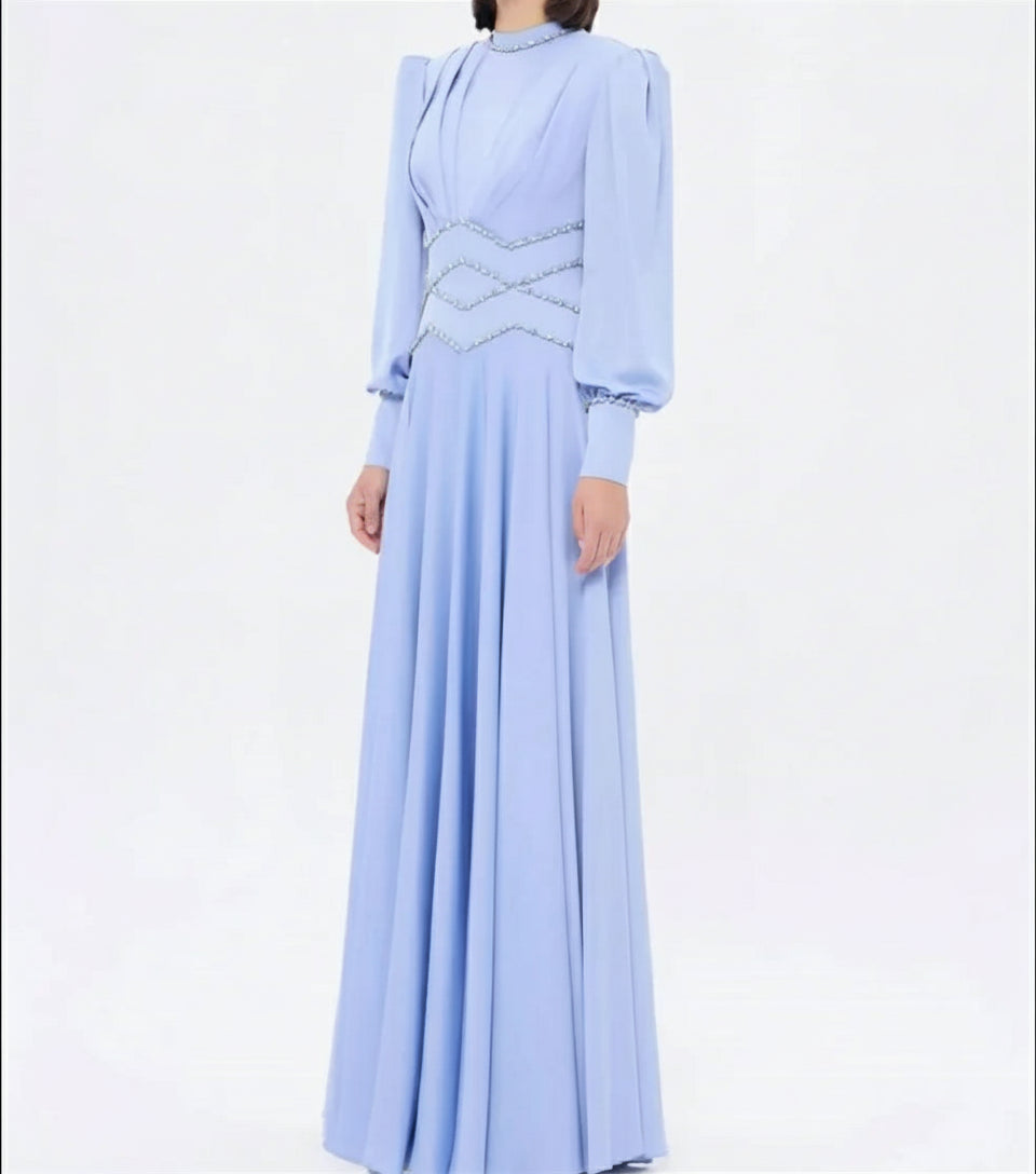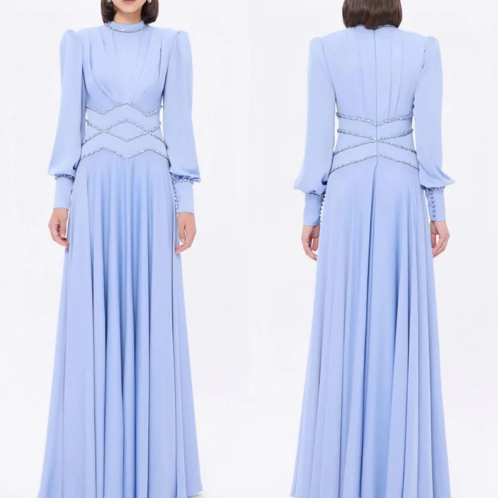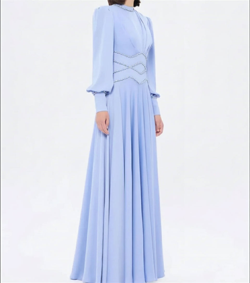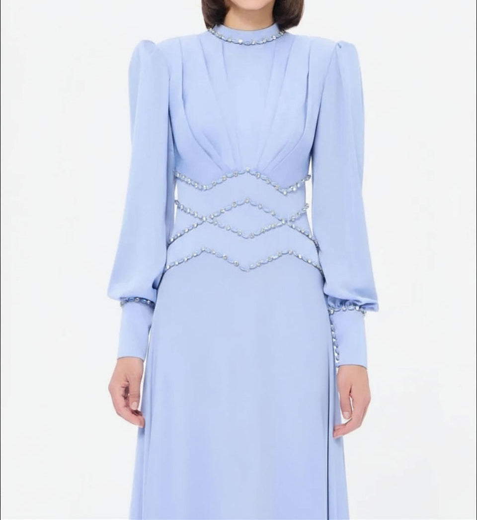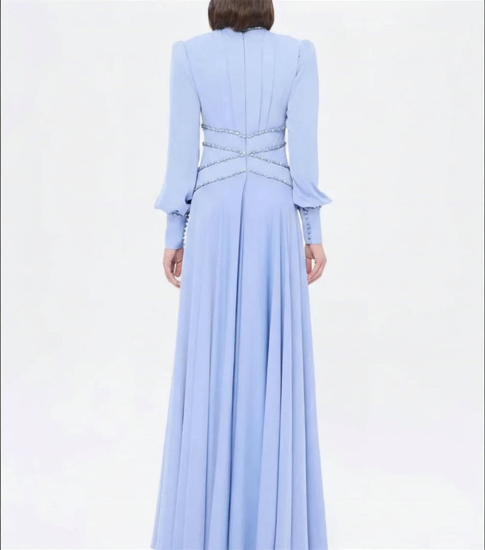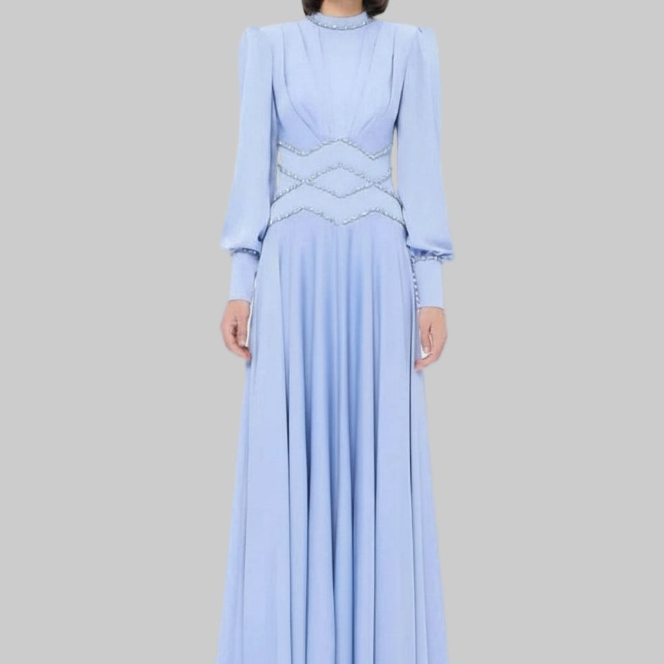 Classic Jersey Button Rhinestone A-line High Collar Long Dress