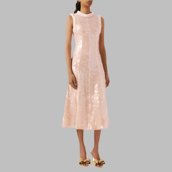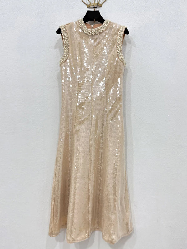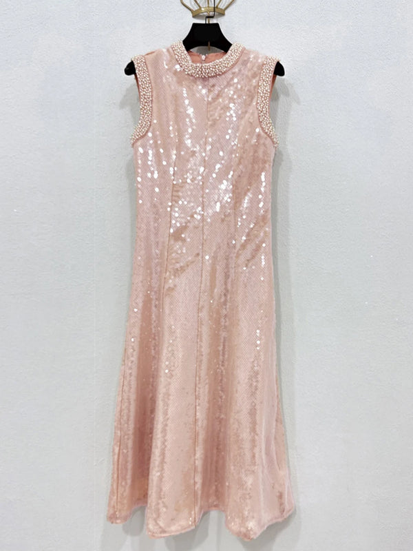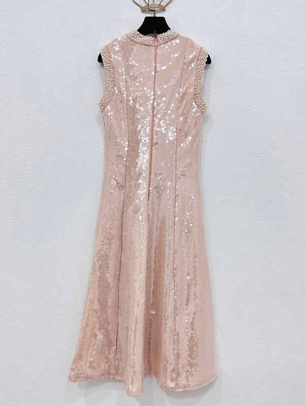 SPECIFICATIONS   Closure Type: zipper Decoration: Sequins Dress Length: Mid-Calf Elasticity: Slight Stretch Fit Type: Slim Neckline: stand Silhouette: Sheath Sleeve Length(cm): sleeveless Sleeve Style: TANK